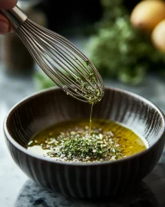 Whisk olive oil, lemon juice, Dijon mustard, garlic, salt, pepper, and oregano together.
