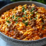 A cozy, creamy, tomato-based orzo dish with seasoned beef, perfect for weeknights and family meals.