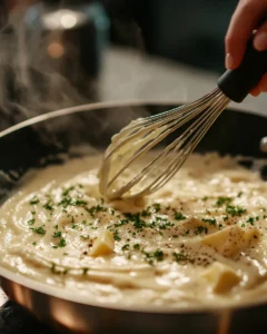 Using the same skillet allows all the flavorful browned bits from the chicken to enhance the sauce. Lower the heat to medium-low and add the remaining butter. Once melted, stir in the minced garlic and cook for about 30 seconds, stirring constantly. The garlic should become fragrant but not browned, as overcooking can make it bitter. Slowly pour in the heavy cream, stirring as you go to create a smooth base. Add the softened cream cheese and continue stirring until it melts completely into the cream. This step creates a thick, velvety foundation for the Alfredo sauce and ensures a luxurious texture.