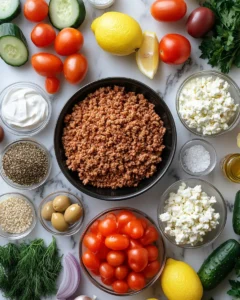 A vibrant and nourishing bowl filled with seasoned ground turkey, wholesome grains, crisp vegetables, and creamy yogurt sauce inspired by Mediterranean flavors.