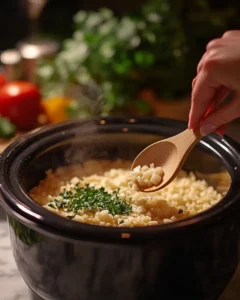 Long grain white rice is often the preferred choice because it cooks evenly and remains fluffy. Jasmine rice is another excellent option because it has a light fragrance and soft texture. Brown rice can also be used if you prefer a whole grain option. However, brown rice requires a longer cooking time and more liquid. If using brown rice in the slow cooker, you may need to extend the final cooking stage by about 20 minutes and add an additional ½ cup (120 ml) of broth to ensure it becomes tender.