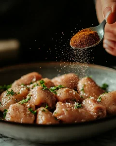 3) Season chicken: Pat chicken dry and season with 1 teaspoon salt, 1/2 teaspoon pepper, 1 teaspoon cumin, 1 teaspoon coriander, and 1 teaspoon paprika.