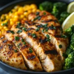To assemble the bowls, slice the rested chicken breasts into strips against the grain. If using rice or quinoa, spoon a base into each bowl. Top with grilled chicken and broccoli, arranging everything neatly for a balanced presentation. Finish with a squeeze of fresh lemon juice or a light sprinkle of sesame seeds if desired. Serve immediately while everything is warm and fresh.