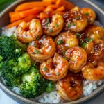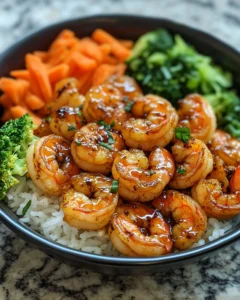 A quick and flavorful shrimp bowl featuring tender shrimp coated in a sweet and savory honey garlic sauce, served over rice with fresh vegetables.