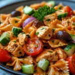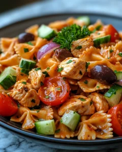 This recipe was inspired by the classic pasta salads often found at Italian-American family celebrations, where simplicity and quality ingredients are celebrated. The bow tie pasta, also known as farfalle, has a playful shape that holds onto dressing beautifully, making every bite flavorful. With crisp vegetables, tender seasoned chicken, and a zesty homemade Italian-style dressing, this salad is designed to be shared, enjoyed, and remembered.