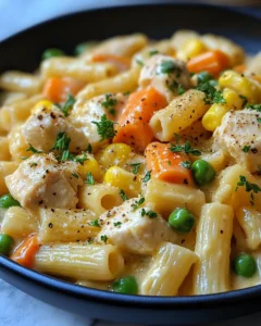 A creamy, comforting pasta inspired by classic chicken pot pie flavors, made easily in one pan for a simple and satisfying meal.