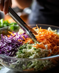 In a large bowl, combine green cabbage, purple cabbage, and carrots.