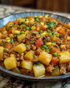 In a large mixing bowl, combine cubed potatoes, carrots, red and green bell peppers, corn, peas, and diced tomatoes. Toss with the cooked ground beef mixture.