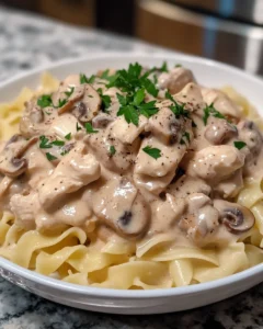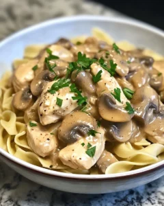 A rich, comforting dish that combines tender chicken with a creamy mushroom sauce, served over warm egg noodles. Perfect for weeknight dinners or cozy family meals.