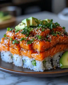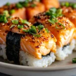 The inspiration for this recipe comes from the creative Japanese-American fusion trend where sushi ingredients meet comfort food techniques. Instead of struggling with delicate rolls, this dish brings all the vibrant flavors of sushi—salmon, spicy mayo, avocado, and nori—into a family-friendly bake. It’s fun to serve, easy to assemble, and perfect for both sushi lovers and beginners alike. Once you try it, this spicy salmon sushi bake will likely become a go-to recipe for celebrations, potlucks, or just a special dinner at home.