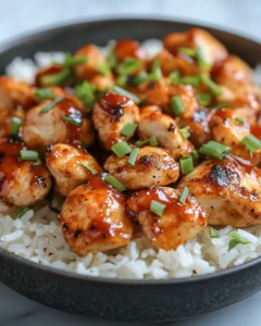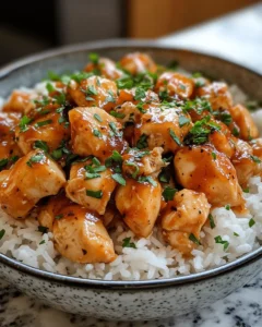 A comforting and flavorful meal featuring tender chicken coated in a sweet and smoky honey BBQ sauce, served over fluffy rice for a satisfying dinner.