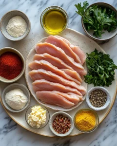 While the chicken chills, prepare your breading station. Place the flour in a shallow bowl or plate. In a second bowl, whisk together the eggs and milk until smooth. In a third bowl, combine the breadcrumbs with paprika and dried parsley, mixing well to distribute the seasoning evenly. Arranging the bowls in this order—flour, egg, breadcrumbs—creates a smooth workflow and keeps your hands from becoming overly messy.