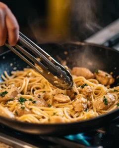 Return the cooked chicken to the skillet, stirring it into the sauce so it’s evenly coated. Add the drained pasta and gently toss everything together, making sure each piece of pasta is wrapped in the creamy garlic Parmesan sauce. If the sauce feels too thick or tight, add a splash of the reserved pasta water, a little at a time, until you reach your desired consistency. The starch in the water helps the sauce cling beautifully to the pasta.