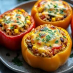 A colorful and hearty vegetarian dish featuring tender bell peppers stuffed with seasoned rice, vegetables, beans, and melted cheese. Perfect for family dinners or meal prep.