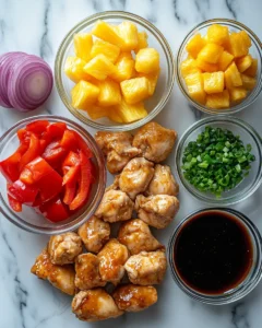 Juicy chicken comes down to three main things: the cut of chicken, oven temperature, and not overcooking. This recipe uses 2 lb (900 g) boneless, skinless chicken thighs because thighs naturally contain a bit more fat than breast meat, so they stay tender at the high heat needed to roast vegetables and pineapple. The oven temperature of 425°F (220°C) is intentional—it promotes browning on the outside while keeping the inside moist, especially when you don’t crowd the pan.