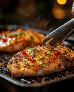 Remove the chicken from the marinade and place it on the hot grill. Cook for about 6–7 minutes per side, depending on thickness, until the internal temperature reaches 74°C (165°F).
