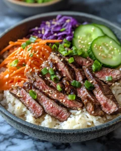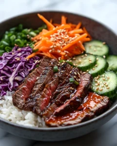 For gatherings, set up a DIY bowl bar where everyone can build their own. Lay out the rice, steak, vegetables, and sauce in separate dishes and let guests customize their bowls to their taste.