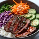 This Korean BBQ Steak Rice Bowl is a bold and comforting dish that combines tender marinated steak, fluffy rice, fresh vegetables, and a rich spicy cream sauce. It is easy enough for busy weeknights but impressive enough for special meals, delivering big flavor in every bite.