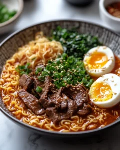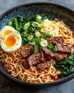 A bold and comforting Korean-inspired noodle soup made with tender beef, spicy broth, and chewy ramen noodles.