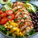 A vibrant and hearty salad bowl loaded with seasoned grilled chicken, black beans, corn, fresh vegetables, creamy avocado, and a zesty lime dressing. Perfect for weeknight dinners or meal prep.