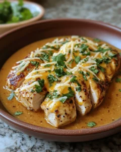 Once cooked, remove the skillet from heat and sprinkle the dish with freshly chopped cilantro if desired. Serve the chicken hot, generously spooned with the creamy cheese sauce for a comforting and flavorful finish.