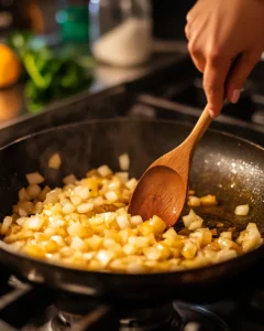 In a large skillet over medium heat, add 2 tablespoons olive oil. Sauté the diced onion for 3–4 minutes until softened. Add the minced garlic and cook for another 30 seconds until fragrant.
