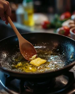 With the vegetables prepped, it’s time to build the sweet and savory glaze that brings the dish together. Place a large skillet over medium heat and add the olive oil and butter. Allow the butter to melt slowly, swirling the pan gently so it combines evenly with the oil. This combination prevents the butter from browning too quickly while adding richness.