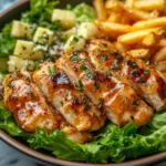 This Hot Honey Crispy Chicken Caesar Salad & Fries is more than just a meal—it’s an experience that brings together comfort, freshness, and bold flavor in a single plate. Each component plays a crucial role: the crisp romaine provides a refreshing base, the creamy Caesar dressing adds richness, the fries bring familiar comfort, and the hot honey chicken delivers that unforgettable sweet-and-spicy finish.