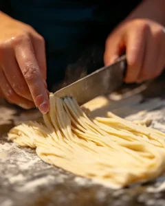 Try to keep the thickness consistent so the noodles cook evenly. Once rolled, cut the ropes into noodle-length strands using a knife or dough scraper. You can leave them long for a rustic look or cut them shorter for easier serving. Place the shaped noodles on a lightly dusted tray while you finish shaping the rest of the dough.