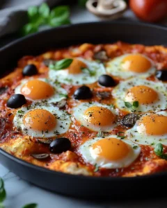 A cozy, skillet-style dish that brings together the comforting flavors of pizza with perfectly cooked eggs.