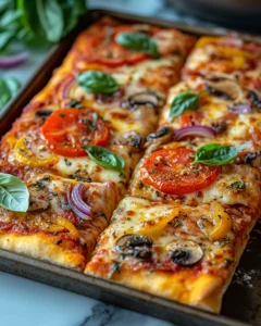 This sheet pan pizza features a fluffy homemade crust, rich tomato sauce, and perfectly melted cheese, making it ideal for family dinners or casual gatherings.