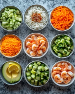 Divide the cooked rice into serving bowls. Arrange the shrimp, cucumber, carrots, and avocado on top.