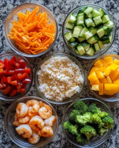 Assemble bowls with rice, vegetables, and shrimp.