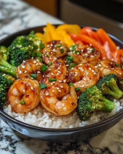 A quick and flavorful bowl featuring juicy shrimp in a sweet chili garlic sauce served over rice with fresh vegetables.