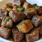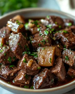 A comforting slow-cooked beef dish featuring incredibly tender steak bites simmered in a rich, savory sauce that’s perfect for family dinners or cozy evenings.