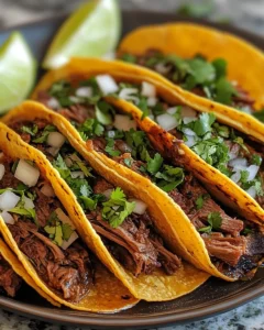Birria tacos shine brightest when served fresh and hot. Arrange them on a large platter with small bowls of broth for dipping. Fresh lime juice adds brightness, while chopped onion and cilantro provide crunch and freshness that balance the richness of the meat.