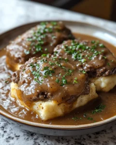 What makes this recipe stand out is the balance between rustic comfort and polished flavor. The meat is seasoned to perfection, shaped into hearty patties, lightly browned, and then smothered in a velvety gravy before baking. As it cooks, the flavors deepen, the sauce thickens, and the entire kitchen fills with aromas that feel like home.