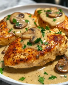 A rich and comforting chicken dinner featuring golden-seared chicken breasts simmered in a creamy mushroom and garlic sauce, perfect for weeknights or special occasions.